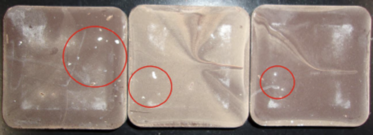 以下の写真のようなものが付着する場合がありますが、これは 原材料のホワイトチョコレートです。召し上がって頂いて問題ありません。